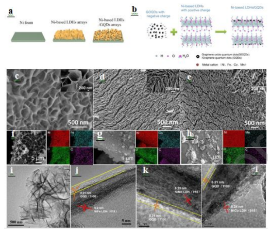 Figure 1.(a-b)鎳基LDH/GQDs納米片陣列合成步驟及原理示意圖。(c-e)不同樣品的SEM圖像(插圖是對(duì)應(yīng)的放大圖)。(f-h)EDS映射圖像。(i-l)不同樣品的TEM和HRTEM圖像。