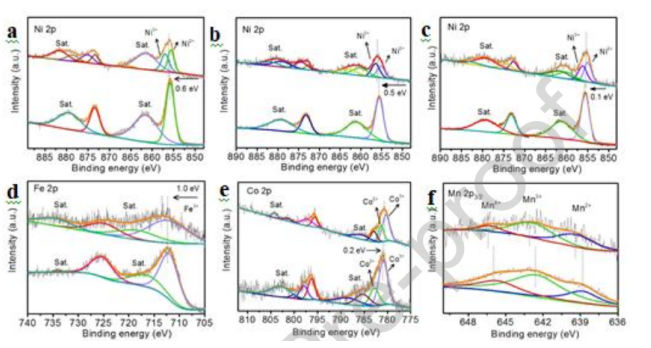 Figure 2. XPS數(shù)據(jù)分析。鎳基LDH/GQD電催化劑的XPS光譜:(a)NiFe LDH和NiFe LDH@GQD的Ni 2p和(d)Fe 2p XPS光譜;(b)NiCo LDH和NiCo LDH@GQD 的Ni 2p和(e)Co 2p XPS光譜;(c)NiMn LDH和NiMn LDH@GQD NiMn的Ni 2p和(f)Mn 2p XPS光譜。