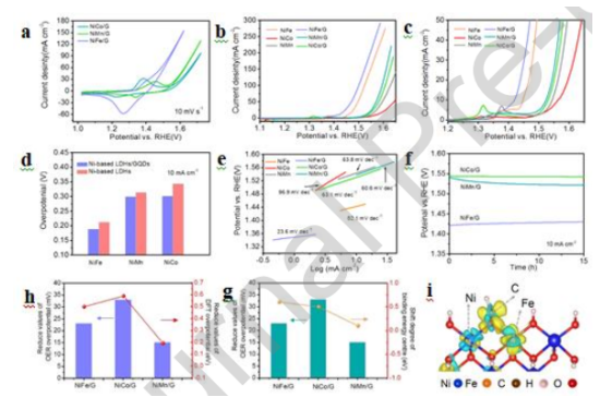 探索具有最佳電子結(jié)構(gòu)的電催化劑,并了解其電子結(jié)構(gòu)和活性之間的關(guān)系,對(duì)于設(shè)計(jì)先進(jìn)的OER催化劑至關(guān)重要。最近,將納米碳材料引入LDHs已經(jīng)被證明是提高OER活性的一種有效方法,但是,深入了解電子結(jié)構(gòu)調(diào)節(jié)活性的相關(guān)機(jī)制仍然是一個(gè)巨大的挑戰(zhàn)。這里,通過(guò)吸附石墨烯量子點(diǎn)(GQDs),調(diào)節(jié)了鎳基層狀雙氫氧化物(NiM-LDHs(M = Fe,Co,Mn))的表面電子結(jié)構(gòu)。鎳基LDH/GQD顯示出增強(qiáng)的OER活性,尤其是NiFe LDH/GQD在10 mA cm-2電流密度時(shí),僅需要189 mV的過(guò)電勢(shì),此外在可充電鋅空氣電池測(cè)試中也顯示出優(yōu)異的性質(zhì)。結(jié)合理論計(jì)算和X射線光電子能譜,將如此好的OER活性歸因于NiFe LDH和GQD之間的強(qiáng)相互作用,這會(huì)改變金屬離子周圍的電荷分布并觸發(fā)鎳活性物種的電荷累積。