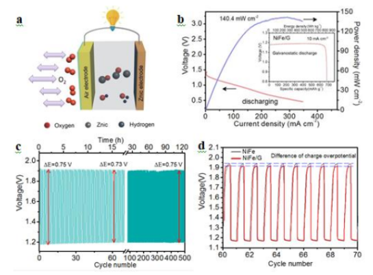 Figure 4. 鋅空氣充電電池的電化學(xué)性能:(a)鋅空氣電池的示意圖;(b)NiFe LDH/GQD 鋅-空氣電池的極化曲線和功率密度曲線, (c)在10 mA cm-2下獲得恒電流充放電循環(huán)測(cè)試;(d)放大的循環(huán)圖像(第60周期至第70周期)。
