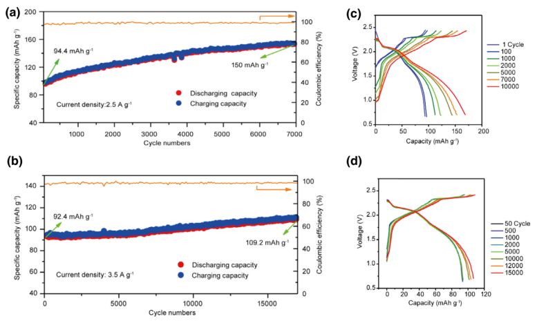 Figure 1. (a)由鎳集流體、石墨烯織物正極和Et-1.5電解質(zhì)制成的電池和(b)由石墨烯織物正極和Emi-1.5組裝而成的電池的恒電流循環(huán)。(c)和(d)是它們?cè)诓煌芷谙碌牡湫秃汶娏髑€。