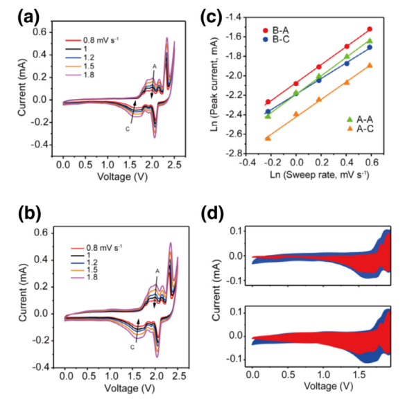 -1的異常狀態(tài)下,Al-G電池的CV曲線。(c)(a)和(b)中對(duì)應(yīng)的線性關(guān)系。(d)在(a)A和(b)B狀態(tài)下的電容(紅色)和擴(kuò)散控制(藍(lán)色)貢獻(xiàn)。