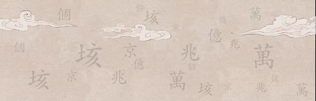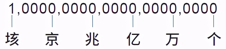 其實,我們祖先的智慧同樣高明,在創(chuàng)造大數(shù)字表達時也是有節(jié)奏的。在數(shù)字表達上英文是每3位數(shù)升一個級,中文是每4位數(shù)升一個級。我們祖先創(chuàng)造出表達數(shù)字的漢字是“個、十、百、千、萬、十萬、百萬、千萬、億、十億、百億、千億、兆、十兆、百兆、千兆、京、十京、百京、千京、垓、十垓、百垓……”。