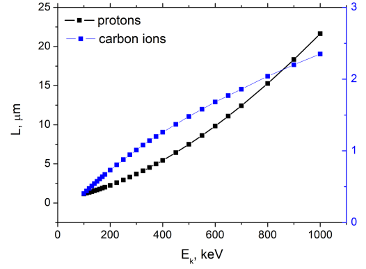 Figure 3. 通過SRIM軟件包計(jì)算的PMMA中質(zhì)子(黑色方塊)和碳離子(藍(lán)色方塊)范圍的相關(guān)性。