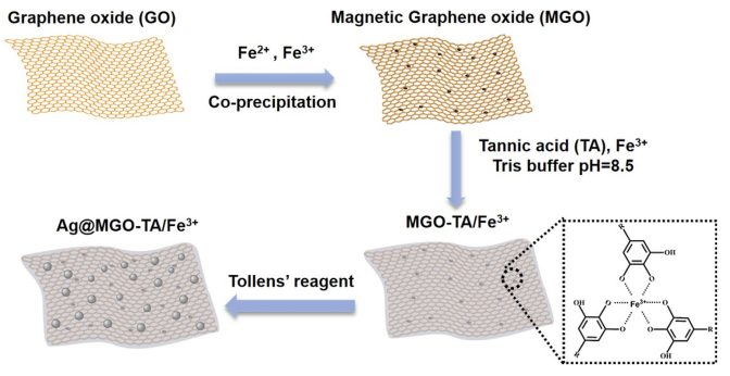 銀納米顆粒(Ag NPs)及其納米復(fù)合材料已被廣泛用作廢水處理的催化劑和消毒劑。然而,大多數(shù)報(bào)道的基于Ag NPs的納米復(fù)合材料具有低的Ag NPs負(fù)載量,這需要高劑量以實(shí)現(xiàn)令人滿意的對(duì)有機(jī)污染物的催化去污性能和對(duì)細(xì)菌的良好消毒。在本文中,我們通過(guò)使用磁性氧化石墨烯(MGO),通過(guò)鞣酸(TA)/Fe