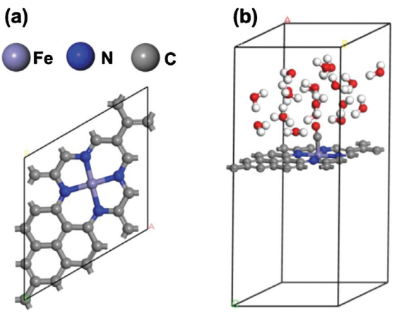 Figure 1. 建模系統(tǒng)的結(jié)構(gòu):包括Fe-N-Gra催化劑、明顯的溶出物和被吸附物。(a)Fe-N-Gra表面的俯視圖;(b)以純水系統(tǒng)中吸附的CO為例,整個系統(tǒng)的側(cè)視圖。