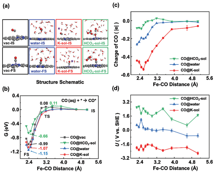 3-sol系統(tǒng)中,CO吸附到Fe中心期間,通過AIMD模擬IS和FS的結(jié)構(gòu)快照。(b)在不同類型系統(tǒng)下,用于CO吸附的自由能分布圖。(c)CO的電荷和(d)系統(tǒng)的電極電勢U。