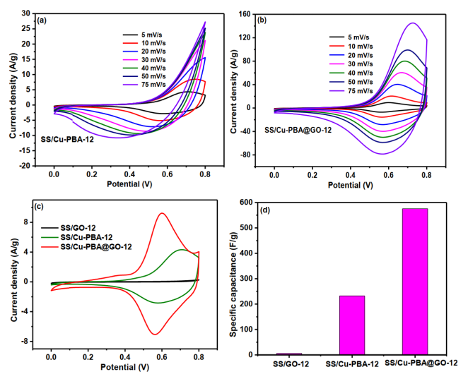 普魯士藍(lán)及其類(lèi)似物作為金屬有機(jī)骨架之一,由于其出色的特性(例如高表面積、3D多孔網(wǎng)絡(luò)和低成本)而通常用于制造儲(chǔ)能電極。但是,它們具有較低的能量密度和電導(dǎo)率,這可能會(huì)限制其進(jìn)一步的應(yīng)用。在本文中,我們利用一種簡(jiǎn)便且自下而上的新協(xié)議,將六氰合鐵酸銅納米立方體(Cu-PBA)沉積在氧化石墨烯(GO)的表面,作為超級(jí)電容器的無(wú)粘合劑電極。本文概述了簡(jiǎn)便的連續(xù)離子層吸附和反應(yīng)(SILAR)技術(shù)的優(yōu)點(diǎn),及用于在便宜的不銹鋼基材上涂覆CuPBA@GO納米復(fù)合材料。研究了反應(yīng)循環(huán)對(duì)Cu-PBA@GO納米復(fù)合材料的形貌、結(jié)晶度和電化學(xué)行為的影響,此外還研究了Cu-PBA與氧化石墨烯之間的有效協(xié)同作用。FTIR,XPS,SEM,TEM和XRD證實(shí)了在Cu-PBA/GO混合薄膜中形成的立方Cu-PBA。有趣的是,在電流密度為0.5 A/g的情況下,混合SS/Cu-PBA@GO-12可以提供611.6 F/g的卓越比電容,這是純Cu-PBA(225.93 F/g)的2.7倍;且具有更好的循環(huán)穩(wěn)定性,在4 A/g的電流密度下,經(jīng)過(guò)2000次循環(huán)后,它可以保留大約86%的初始電容。此外,混合電極在200 W/kg的比功率下可以達(dá)到54.37 Wh/kg的最高能量密度值。Cu-PBA@GO雜化物的這種出色電化學(xué)行為可通過(guò)使用綠色且經(jīng)濟(jì)高效的方法代替有機(jī)基超級(jí)電容器,為智能和柔性超級(jí)電容器的開(kāi)發(fā)開(kāi)辟道路。