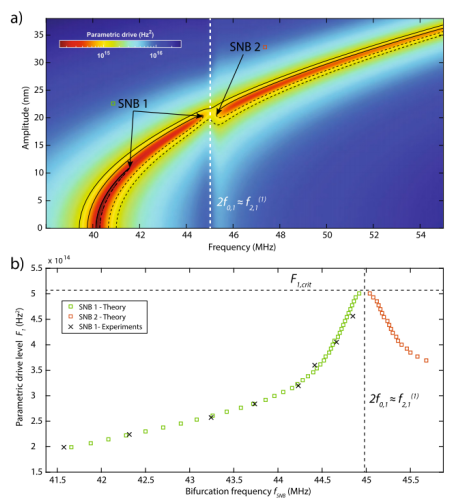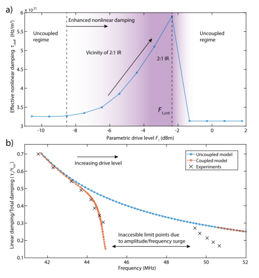 從固態(tài)物理學到熱力學,非線性阻尼的機械源在現(xiàn)代物理學中起著核心作用。機械耗散的微觀理論表明,當共振模式的非線性阻尼耦合到接近其共振頻率兩倍的振動模式時,可以大大增強共振模式的非線性阻尼。迄今為止,尚未實現(xiàn)這種增強的實驗證據(jù)。在本文中,我們通過實驗證明,納米諧振器驅(qū)動成直接參數(shù)內(nèi)共振,為非線性耗散的微觀理論提供了支持證據(jù)。通過調(diào)節(jié)驅(qū)動電平,我們可以在40-70 MHz的范圍內(nèi)調(diào)整石墨烯納米鼓的參數(shù)共振,以達到連續(xù)的二對一內(nèi)部共振,從而使非線性阻尼幾乎增加了兩倍。我們的研究開辟了一條利用模態(tài)相互作用和參數(shù)共振來實現(xiàn)具有工程非線性耗散的寬頻率范圍諧振器的途徑。