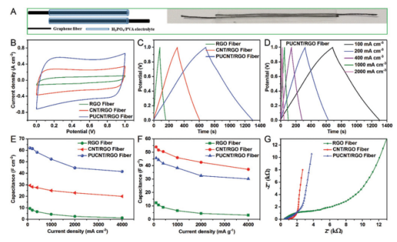 Figure 4. RGO,CNT/RGO和PUCNT/RGO纖維基SC的電化學(xué)性能。A)纖維狀SC的示意圖和照片。B,C)在10 mV s–1掃描速率下的CV曲線和在100 mA cm–3的電流密度下的GCD曲線。D)PUCNT/RGO纖維在各種電流密度下的GCD曲線。E,F(xiàn))不同電流密度下的體積和質(zhì)量電容。G)電化學(xué)阻抗譜。