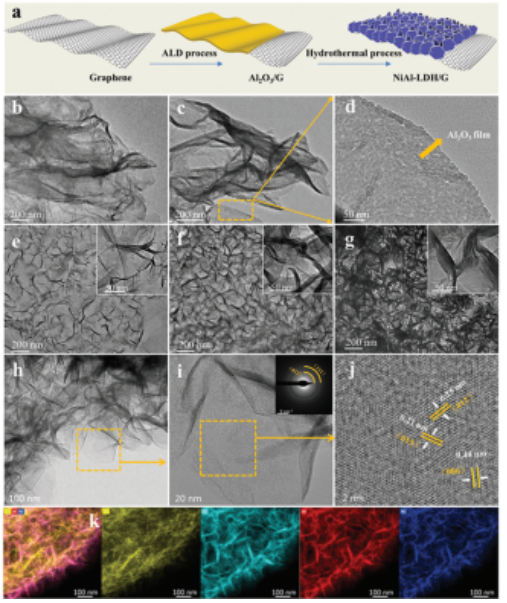 Figure 1. a)NiAl-LDH/G制備過(guò)程的示意圖。b-g)NiAl-LDH/G及其它對(duì)照樣品的TEM圖。100 NiAl-LDH/G樣品中NiAl-LDH納米薄片的h,i)TEM圖和j)HRTEM圖。k)C,O,Al和Ni的元素映射。