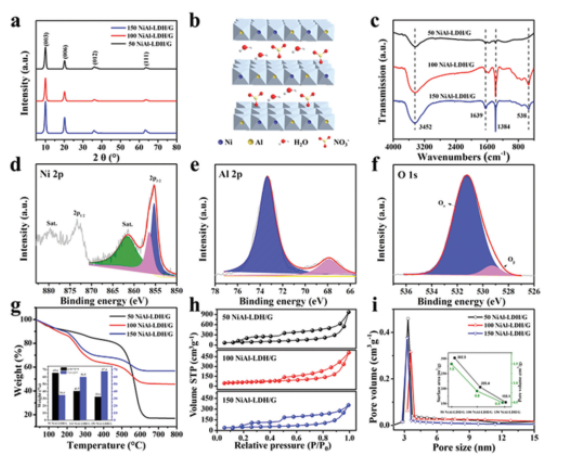 Figure 2. a)NiAl-LDH/G樣品的XRD圖譜。 b)NiAl-LDH-NO3-的晶體結(jié)構(gòu)。 c)NiAl-LDH/G樣品的FTIR分析。d-f)XPS圖譜。g)TG曲線。h)NiAl-LD/G樣品的BET表面積,和i)孔徑分布。