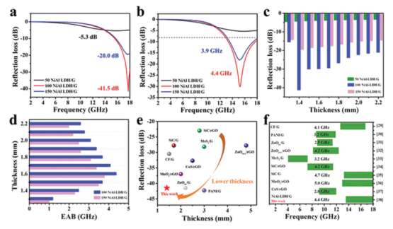 Figure 3. 不同樣品分別在a)1.4 mm和b)1.6 mm厚度下的RL值。NiAl-LDH/G樣品在厚度為1.4-2.2mm范圍內(nèi),c)最低RL和)最大EAB值。e)最小微波RL和f)最大EAB值與先前報(bào)道的其他石墨烯基吸收器相比較。