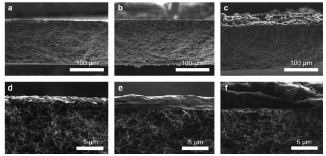 Figure 4.(a)原始PES,(b)GO涂層的PES和(c)激光還原GO涂層的PES的低倍SEM橫截面圖像。(d)原始PES,(e)GO涂層PES和(f)激光還原GO涂層的PES的高倍SEM圖像。