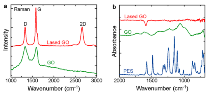 Figure 2.(a)有無激光照射的GO薄膜的拉曼光譜。(b)不同樣品的ATR-FTIR光譜。