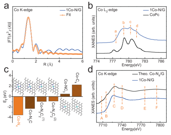 Figure 2. Co原子周圍的配位構(gòu)型。a)在R空間中的Co K邊緣EXAFS擬合曲線。b)Co L3-edge XANES光譜。c)DFT計算了石墨烯晶格中各種Co-N4-xCx部分的形成能。d)實驗性Co-edge XANES光譜比較。