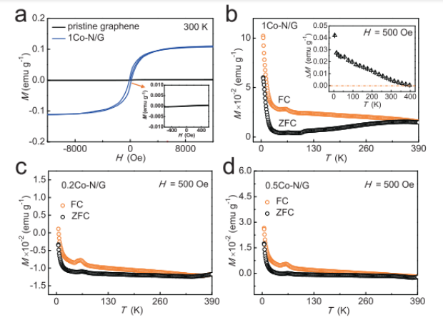 Figure 3. 磁性能。a)扣除背景后,原始石墨烯和1Co-N/G納米片的磁化強(qiáng)度與磁場(MH)曲線。b)1Co-N / G納米片的FC和ZFC磁化強(qiáng)度(MT)的溫度依賴性。c,d )FC和ZFC磁化強(qiáng)度(M–T)曲線的溫度依賴性。