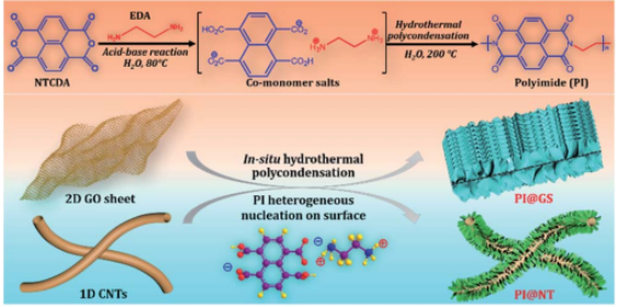 Figure 1. 單體和聚酰亞胺的化學(xué)結(jié)構(gòu),以及PI@GS和PI@NT復(fù)合材料的合成路線。