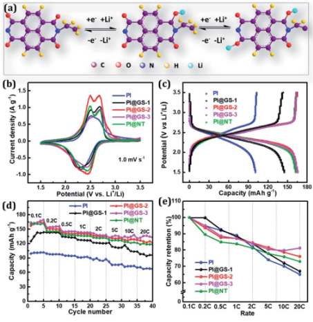 Figure 5(a)雜環(huán)亞胺組在PI鏈重復(fù)單元中的鋰存儲(chǔ)機(jī)制。電化學(xué)性能:(b)典型CV曲線和(c)充電/放電電壓曲線; PI,PI@GS和PI@NT陰極的(d)倍率特性和(e)在各種電流速率下保留的容量。