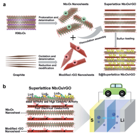 Figure 1.(a)制備超晶格Nb3O8/rGO陰極的示意圖,和(b)超晶格Nb3O8/rGO在鋰硫電池應(yīng)用中的優(yōu)點。