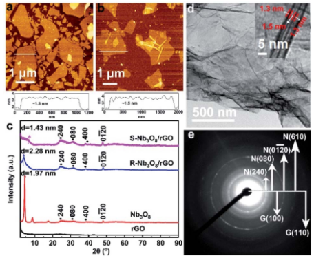 Figure 2. (a)單層Nb3O8和(b)PDDA修飾的rGO納米片的AFM圖像和高度情況;(c)不同樣品的XRD圖比較; (d)S-Nb3O8/rGO的TEM圖像和(e)SAED模式。