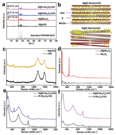 Figure 3(a)不同樣品的XRD圖比較;(b)S@R-Nb3O8/rGO和S@S-Nb3O8/rGO的示意圖;(c-f)不同樣品的拉曼光譜比較。