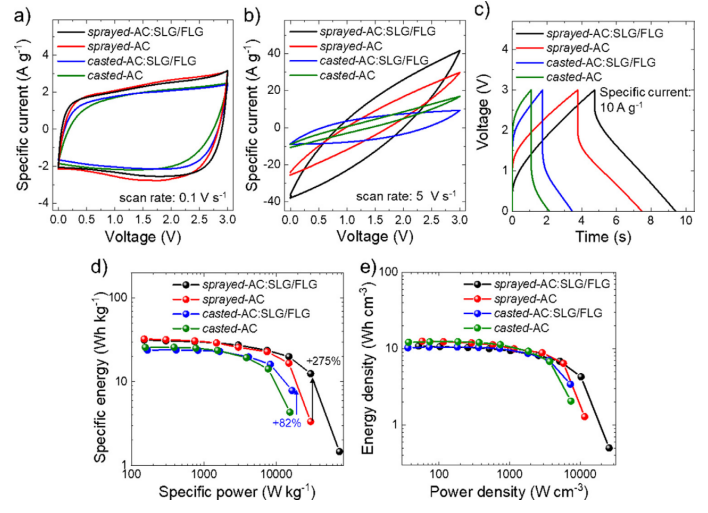 -1下,噴涂和鑄造EDLCs的GCD曲線。d,e)噴涂和鑄造EDLCs的Ragone圖之間的比較。