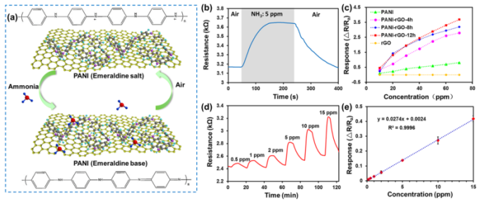 在這篇報告中,我們開發(fā)了一種簡單的方法來合成均勻的石墨烯異質(zhì)結(jié)構(gòu)。本文制備了具有二維PANI石墨烯異質(zhì)結(jié)構(gòu)和還原氧化石墨烯(rGO)摻雜聚苯胺(PANI)納米片的室溫半導體材料,并在異質(zhì)結(jié)構(gòu)的結(jié)構(gòu)-性質(zhì)耦合效應基礎上獲得了良好的氨氣傳感性能。rGO-PANI納米片具有成本低、環(huán)境友好、重復性好、選擇性好、可大規(guī)模合成等優(yōu)點。此外,該傳感器對NH
