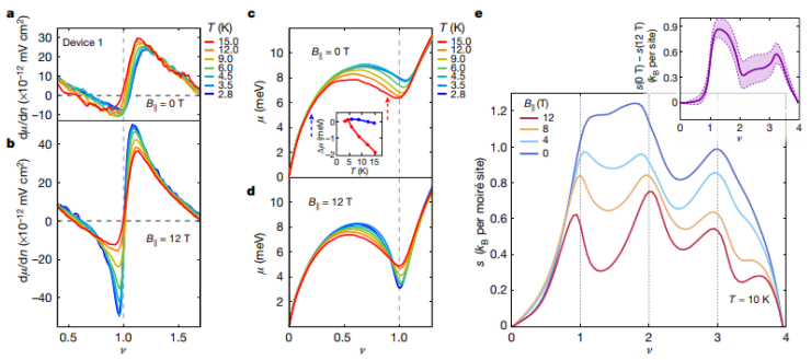 3He在加熱時(shí)可能會(huì)凝固,這與我們的直覺(jué)相反。這種效應(yīng)是由固相原子在空間局部存在的高過(guò)量核自旋熵引起的。在此,我們發(fā)現(xiàn)在魔角石墨烯中發(fā)生了類(lèi)似的效應(yīng)。使用局部和全局電子熵測(cè)量,發(fā)現(xiàn)在每個(gè)摩爾單位晶胞填充一個(gè)電子時(shí),電子熵顯著增加到每個(gè)單位晶胞約1kB(kB是玻爾茲曼常數(shù))。巨大的過(guò)量熵被指向其磁源的平面內(nèi)磁場(chǎng)淬滅??蓧嚎s性隨電子密度的變化急劇下降,費(fèi)米能級(jí)重新回到狄拉克點(diǎn)附近,標(biāo)志著兩相之間的界限清晰。我們將此躍變映射為電子密度,溫度和磁強(qiáng)的函數(shù)。這揭示了一個(gè)相圖,與Pomeranchuk的一樣,溫度和磁場(chǎng)驅(qū)動(dòng)了從低熵電子液體到具有幾乎自由磁矩的高熵相關(guān)態(tài)轉(zhuǎn)變。相關(guān)態(tài)的特點(diǎn)是看似相互矛盾性質(zhì)的不尋常組合,其中一些特性與流動(dòng)電子有關(guān),例如不存在熱力學(xué)帶隙,金屬性和狄拉克式的可壓縮性,而其他特性與局部矩有關(guān),例如大的熵及其在磁場(chǎng)下的消失。此外,表征這兩組特性的能量尺度是非常不同的:可壓縮性躍遷的起始溫度約為30 K,而磁激發(fā)的帶寬約為3 K或更小。當(dāng)前相關(guān)態(tài)的混合性質(zhì)和能量尺度的大分離對(duì)扭曲雙層石墨烯相關(guān)態(tài)的熱力學(xué)和傳輸特性有影響。