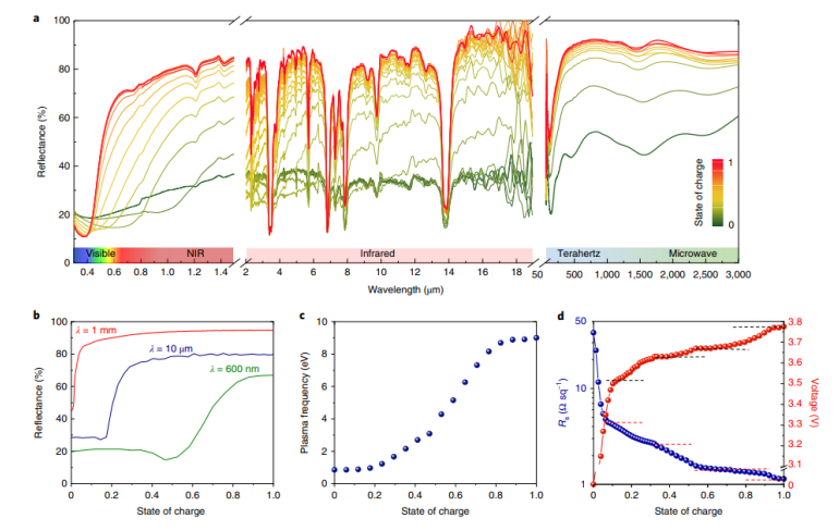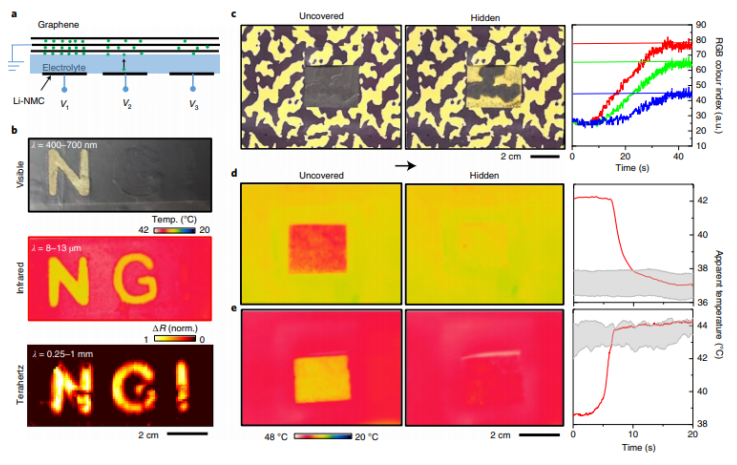 具有變色能力的光學(xué)材料已被用于顯示設(shè)備、智能窗口或調(diào)節(jié)視覺外觀。但是,這些材料的效率具有很強(qiáng)的波長依賴性,使得其部分功能限制在特定的光譜范圍內(nèi)。在這里,本文報(bào)道了基于石墨烯的電光器件,其空前的光學(xué)可調(diào)性涵蓋了從可見光到微波的整個(gè)電磁頻譜。我們通過將鋰電插入光學(xué)可及器件結(jié)構(gòu)中的石墨烯層中,實(shí)現(xiàn)了這種非易失性和可逆的可調(diào)性。獨(dú)特的變色功能以及區(qū)域選擇性插入,激發(fā)了新型多光譜設(shè)備的制造,包括顯示設(shè)備和電光偽裝涂層。我們預(yù)計(jì),這些結(jié)果將為可編程的智能光學(xué)表面提供現(xiàn)實(shí)的方法,并在許多科學(xué)和工程領(lǐng)域(如有源等離子體激元和自適應(yīng)熱管理)中具有潛在的實(shí)用性。
