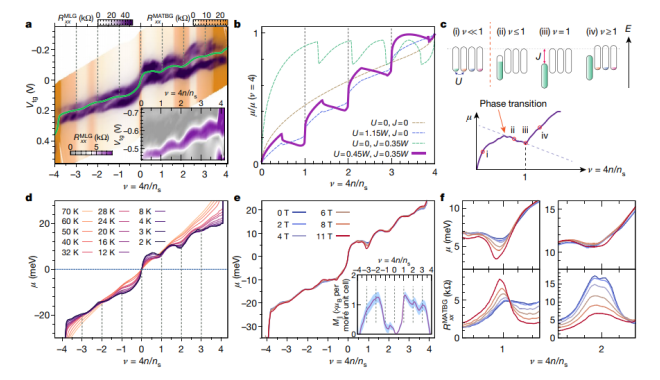 相互作用驅(qū)動的自發(fā)對稱破壞是物質(zhì)許多量子相的核心。在moiré系統(tǒng)中,平坦帶中破缺的旋轉(zhuǎn)/山谷“favour’”對稱構(gòu)成了父態(tài),相關(guān)基態(tài)和拓?fù)浠鶓B(tài),最終由此產(chǎn)生。然而,這種有利于對稱破缺的微觀機(jī)制及其與低溫相的聯(lián)系尚不清楚。在這里,該文同時(shí)進(jìn)行熱力學(xué)和輸運(yùn)測量,研究了魔角扭曲雙層石墨烯(MATBG)的破缺對稱多體基態(tài)及其非平凡拓?fù)?。直接觀察到了摩爾對稱性破缺是moiré超晶格所有整數(shù)填充物上化學(xué)勢的釘扎固定引起的,這證明了Flavour Hund耦合在多體基態(tài)中的重要性。打破時(shí)間反轉(zhuǎn)對稱破缺的情況下,基本平面帶的拓?fù)湫再|(zhì)得以體現(xiàn),分別在1、2、3處測量了Chern數(shù)為3,2,1的Chern絕緣子態(tài)對應(yīng)的能隙,這與MATBG的Hofstadter 蝴蝶光譜的味對稱破損是一致的。此外,電阻率和化學(xué)勢的同步測量提供了奇異金屬狀態(tài)下MATBG 隨溫度變化的電荷擴(kuò)散率——以前只有在超冷原子中才發(fā)現(xiàn)過該數(shù)量。該研究結(jié)果使人們更趨近于一個(gè)統(tǒng)一的框架,以了解具有或不具有磁場的MATBG拓?fù)鋷е械南嗷プ饔谩?br />