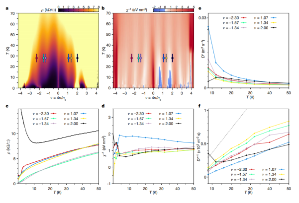 Fig. 4 奇異金屬狀態(tài)下MATBG的電阻率、電子壓縮系數(shù)和擴(kuò)散系數(shù)。