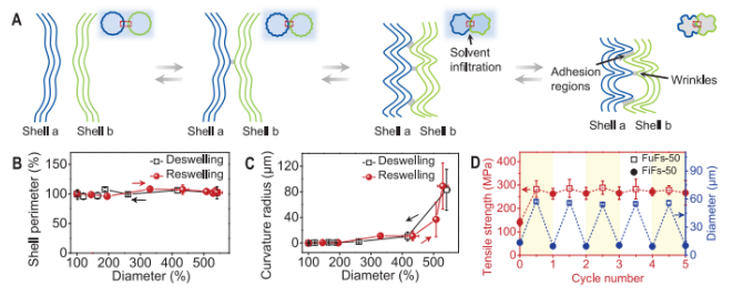 Figure 3.可逆融合和裂變的動態(tài)形貌變形機制。(A)自融合和自裂變的可逆恢復(fù)的殼層形貌皺褶示意圖。(B)在膨脹和溶脹過程中,單根水溶脹GO纖維的殼周長隨纖維直徑的變化。(C)在不同纖維直徑下單位波紋的平均尖端曲率半徑。(D)FuF-50和FiF-50的拉伸強度和相應(yīng)的直徑與循環(huán)次數(shù)的函數(shù)關(guān)系。