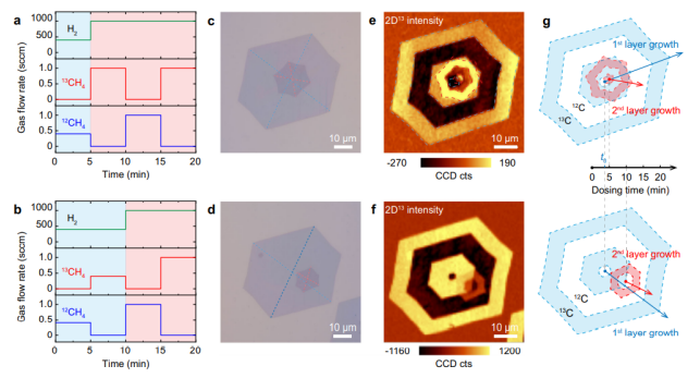 Fig. 2 異位成核和tBLGs的生長過程,通過同位素標記結(jié)合顯微拉曼光譜法進行可視化。