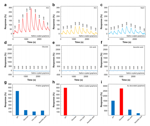 Fig. 6 Nafion涂層石墨烯的選擇性測試以及三種SFETs結(jié)果。