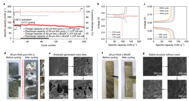 Fig. 5 超薄Li@eGF薄膜提高了鋰||LFP全電池的穩(wěn)定性。