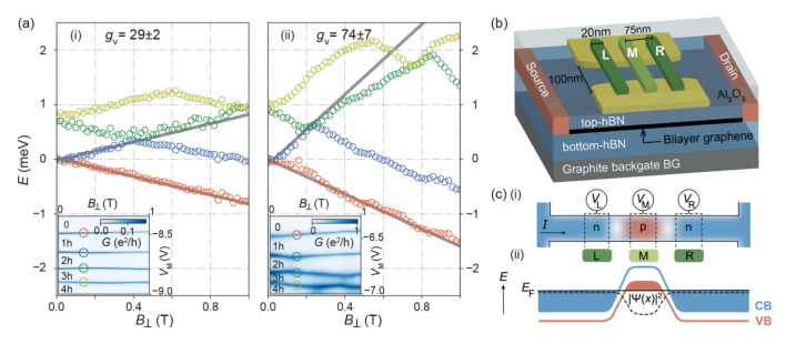 石墨烯中的量子態(tài)在自旋中是2倍簡并,在谷中是2倍。兩個自由度均可用于量子位制備。在我們的雙層石墨烯量子點中,我們證明了谷g-因子g