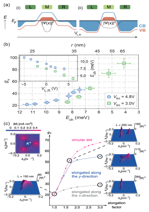 v 作為降低充電能量的函數(shù)(即增加電子點半徑)。(c) 計算出的不同大小和形狀的點的動量空間波函數(shù)和谷g-因子。