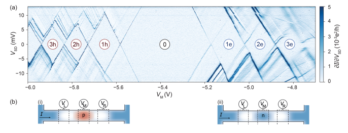 Figure 3. (a) 庫侖鉆石顯示了我們 QD 的雙極操作。 (b) 通道的示意圖。