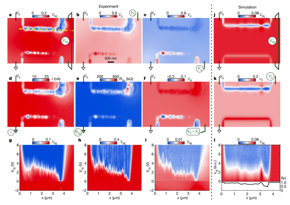 范德瓦爾斯異質(zhì)結(jié)構(gòu)具有許多獨特的電子性質(zhì)。非局部測量,即在遠(yuǎn)離預(yù)期經(jīng)典載流子流的接觸處測量電壓,已廣泛用于尋找新的輸運機制,包括無耗散自旋和谷輸運拓?fù)潆姾芍行粤黧w動力流和螺旋邊緣模式。已經(jīng)發(fā)現(xiàn)單層、雙層、少層石墨烯、過渡金屬二鹵化物和莫爾超晶格顯示出明顯的非局部效應(yīng)。然而,這些效應(yīng)的起源仍存在激烈的爭論。特別是石墨烯,在電荷中性時表現(xiàn)出巨大的非定域性,這一驚人的行為吸引了其他不同的解釋。鑒于此,作者利用尖端的超導(dǎo)量子干涉裝置(SQUID-on-tip)進(jìn)行納米尺度的熱成像和掃描柵成像,證明了石墨烯邊緣常見的電荷積累會導(dǎo)致巨大的非定域性,產(chǎn)生支持長程電流的狹窄導(dǎo)電通道。出乎意料的是,邊緣電導(dǎo)雖然對零磁場下的電流流動影響不大,但在中等磁場下會導(dǎo)致邊緣和體輸運之間的場致解耦。在電荷中性處以及遠(yuǎn)離電荷處所產(chǎn)生的巨大的非定域性會產(chǎn)生對邊緣無序敏感的奇異流動模式,其中電荷可以逆著全局電場流動。觀測到的一維邊緣輸運是通用的和非拓?fù)涞模A(yù)計將支持許多電子系統(tǒng)中的非局部輸運,揭示了許多有爭議的觀察結(jié)果,并將它們與系統(tǒng)邊緣上的遠(yuǎn)程引導(dǎo)電子態(tài)聯(lián)系起來。