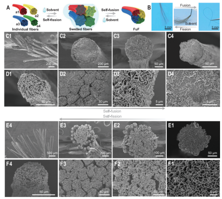 刺激響應(yīng)融合和裂變在生物組織和人工分子組裝中被廣泛觀察到。然而,在重復(fù)聚變和裂變過程中,設(shè)計一個結(jié)構(gòu)和性能持久的系統(tǒng)仍然具有挑戰(zhàn)性。作者展示了濕紡氧化石墨烯 (GO) 纖維的可逆融合和裂變,其中許多宏觀纖維可以融合成更粗的纖維,也可以在溶劑的刺激下分離成原始的單根纖維。其中,由溶劑蒸發(fā)和滲透引起的GO纖維殼的動態(tài)幾何變形是可逆熔裂循環(huán)的關(guān)鍵。這一原理被擴(kuò)展到實現(xiàn)復(fù)雜纖維組件和客體化合物的包含或排出之間的靈活過渡。
