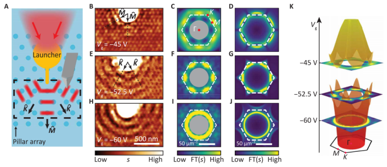通過將光與物質(zhì)混合,可以實(shí)現(xiàn)對光子的有效控制。通過操縱其光子或物質(zhì)成分,可以輕松地對生成的光物質(zhì)準(zhǔn)粒子進(jìn)行編程。在這里,我們將紅外光子與石墨烯Dirac電子雜交,形成表面等離子體激元(SPPs),并發(fā)現(xiàn)了一種以前未探索過的方法來控制具有周期性調(diào)制載流子密度結(jié)構(gòu)中的SPPs。在這些周期結(jié)構(gòu)中,具有連續(xù)色散的普通SPPs轉(zhuǎn)化為帶有帶隙分隔的離散帶的Bloch極化子。作者還探索了定向Bloch極化子,并通過調(diào)整適當(dāng)?shù)臇艠O電壓來控制它們的傳播。對近場圖像的傅立葉分析證實(shí)了這種按需納米光學(xué)功能是基于極化帶結(jié)構(gòu)。該可編程極化平臺為實(shí)現(xiàn)片上光子電路備的優(yōu)勢鋪平了道路。
