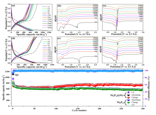 Figure 4.(a)Ni5P4 和(d)Ni5P4@FG 電極在不同次循環(huán)的恒電流鋰嵌入/脫嵌曲線,特定電流密度為 500 mA g-1。 (b 和 c)Ni5P4 和 (e 和 f) Ni5P4@FG 電極在一系列循環(huán)后的 DDC 和 DCC 圖。(g) 兩個樣品在300 次循環(huán)后的比充放電容量和庫侖效率的比較。