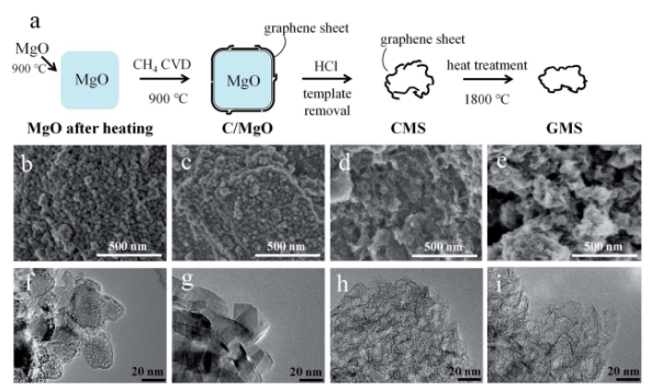 Figure 3. (a) GMS 合成過程示意圖。(b-e) 預(yù)熱后的MgO、C/MgO、CMS 和GMS的SEM 圖像。(f-i)預(yù)熱后的 MgO、C/MgO、CMS 和GMS的TEM 圖像。
