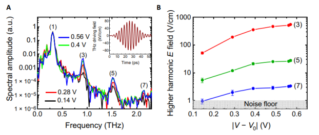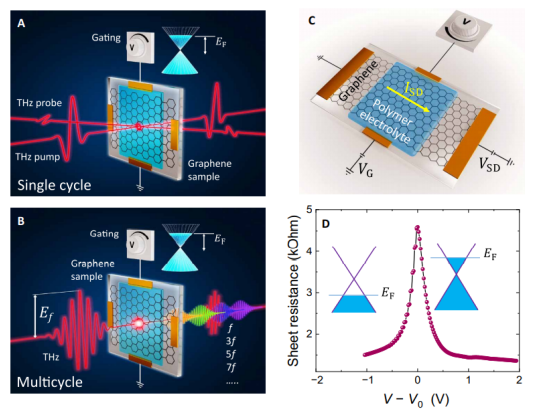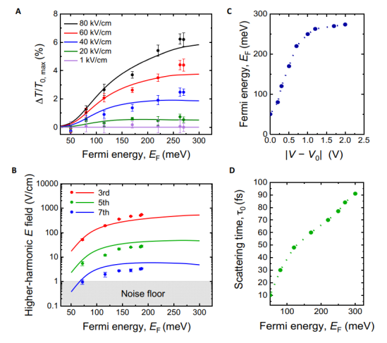 石墨烯可能是現(xiàn)已知的最非線性的光電材料。它在太赫茲頻率范圍內(nèi)的非線性光學(xué)系數(shù)比其他材料高出許多數(shù)量級(jí)。在這里,我們展示了石墨烯的太赫茲非線性,無論是對(duì)于超短單周期和準(zhǔn)單色多周期輸入太赫茲信號(hào),都可以通過使用低至幾伏特的門控電壓有效地控制。例如,在太赫茲三次諧波產(chǎn)生的石墨烯中,最佳的門控能將功率轉(zhuǎn)換效率提高約兩個(gè)數(shù)量級(jí)。我們的實(shí)驗(yàn)結(jié)果與石墨烯非線性的物理模型定量一致,描述了在與超快電場相互作用期間石墨烯電子群中保持的與時(shí)間相關(guān)的熱力學(xué)平衡。該研究結(jié)果可以為在超高頻石墨烯中高效電子信號(hào)處理的直接和準(zhǔn)確的器件設(shè)計(jì)和應(yīng)用提供基礎(chǔ)。