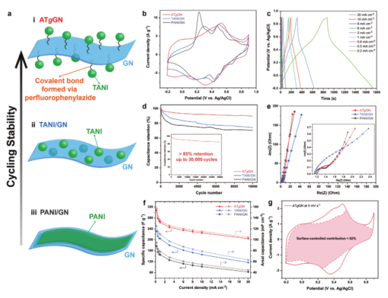 Figure 3. 研究和比較了不同電極在1.0 M H2SO4條件下的電化學(xué)性能。a) ATgGN、TANI/GN、PANI/GN結(jié)構(gòu)示意圖。b)各樣品在20 mV s−1掃描速率下的CV曲線。c) ATgGN電極在不同電流密度下的GCD曲線。d) 10000次充放電循環(huán)的循環(huán)穩(wěn)定性研究。e)奈奎斯特圖。f)倍率特性研究,比電容和面積電容作為電流密度的函數(shù)。g)在5 mV s−1時(shí),定量ATgGN電極中表面控制和擴(kuò)散控制的電荷存儲(chǔ)。