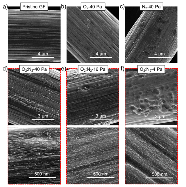 Figure 1. 原始和等離子體處理的GFs的形態(tài)學(xué)分析。(a) 原始GFs的SEM圖像;(b) O