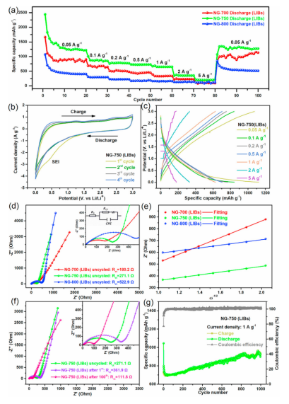 Figure 4. 合成的N摻雜石墨烯的電化學(xué)鋰存儲性能。