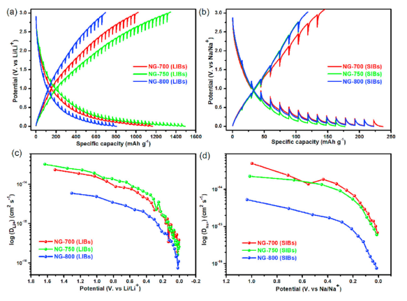 Figure 6. (a) LIBs和 (b) SIBs中N摻雜石墨烯的GITT曲線; (c) Li