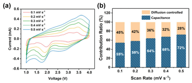 2@C在不同掃描速率下 20 次循環(huán)后的 CV 曲線。(b) 不同掃描速率下,電容和擴散控制的電容貢獻百分比。